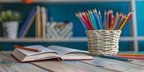 Study desk with a book open and a basket of colored pencils background - Ai Generated