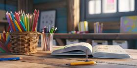 Study desk with a book open and a basket of colored pencils background - Ai Generated