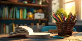 Study desk with a book open and a basket of colored pencils background - Ai Generated