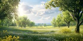 Summer with trees and meadows in bright sunshine background - Ai Generated