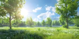 Summer with trees and meadows in bright sunshine background - Ai Generated