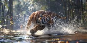 Tiger runs in water in forest background - Ai Generated