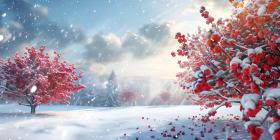 Winter park at snowfall with red wild apple trees background - Ai Generated