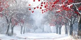 Winter park at snowfall with red wild apple trees background - Ai Generated