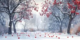 Winter park at snowfall with red wild apple trees background - Ai Generated