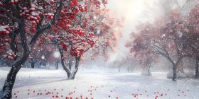 Winter park at snowfall with red wild apple trees background - Ai Generated
