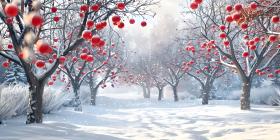Winter park at snowfall with red wild apple trees background - Ai Generated