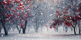 Winter park at snowfall with red wild apple trees background - Ai Generated