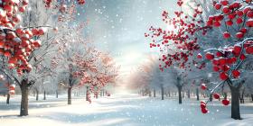 Winter park at snowfall with red wild apple trees background - Ai Generated