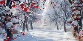 Winter park at snowfall with red wild apple trees background - Ai Generated
