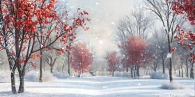 Winter park at snowfall with red wild apple trees background - Ai Generated