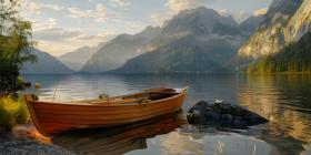 Wooden boat parked at evening with mountains on background - Ai Generated
