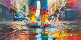 Child in Colorful Rain Boots Splashes Water on street background - Ai Generated