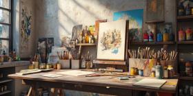Sunlit Artists Studio with Vibrant Colors and Supplies