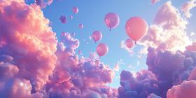 Pink and Purple Hot Air Balloons Soaring Through Dreamy Clouds