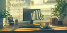 home office desk workspace sunlight window blinds plants cozy minimal aesthetic computer keyboard monitor books mug desk setup office decor interior design natural light calm serene peaceful productive organized clean tidy bright yellow green wooden desk office supplies work from home remote work home workspace comfortable inspiration relaxing creative focus concentrate study work officeSimilar Photos
