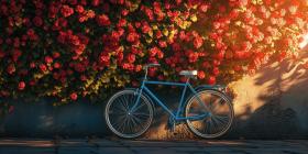 bicycle bike blue bicycle flowers red flowers blooming flowers plant nature outdoor wall road street park sunset golden hour evening shadow beautiful scenic landscape photography image picture photo still life vibrant colors color red blue green dark light contrast texture background wall bush plant life floral wheel cycling transportSimilar Photos