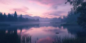 lake sunrise sunset nature landscape water trees forest sky clouds calm peaceful serene tranquil mist fog morning twilight reflection still quiet beautiful scenic view panorama photography image picture photo background wallpaper desktop screen art artwork digital art illustration graphics visual aesthetic pretty colors purple pinkSimilar Photos