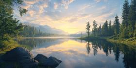 lake sunrise sunset nature peaceful calm serene water trees forest mountains landscape scenic beautiful sky clouds reflection tranquil quiet still morning evening golden hour outdoors view scenery panorama background wallpaper desktop image photo picture digital art artwork illustration art design graphics visualSimilar Photos