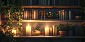 Cozy Bookshelf Candles Night Reading Atmosphere Image