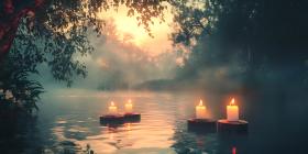 sunset river water mist fog candles tranquil serene peaceful calm nature landscape scenic evening twilight golden hour magical dreamy fantasy artistic illustration artwork digital art painting image background wallpaper desktop mobile screen ambiance mood atmosphere relaxing meditation yoga spiritual healing peace harmony quiet stillness dark lightSimilar Photos
