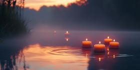 sunset lake water reflection candles floating candles serene calm peaceful tranquil evening twilight mist fog nature landscape background image photography still quiet relaxing ambient atmosphere romantic meditation spa wellness yoga peace harmony zen spiritual serenity calmness tranquility beauty golden hour magical dreamySimilar Photos