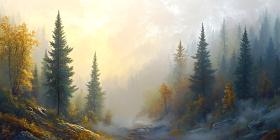 misty forest sunrise landscape painting serene calm peaceful trees coniferous trees evergreen trees fog haze morning mist autumn colors fall colors golden light soft light sun rays path trail woodland forest path nature natural landscape scenic view artistic artwork painting illustration digital painting fine art art beautiful breathtaking tranquil quiet peaceful scene forest scene nature scene outdoor scene landscape photography environmental art autumnal fall foggySimilar Photos