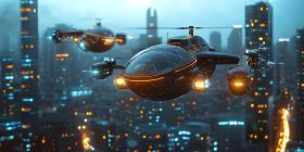Futuristic Cityscapes Flying Vehicles Over a Neon Metropolis