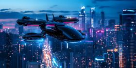 Futuristic Cityscape Flying Vehicles Over Neon Skyline
