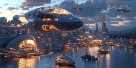 Futuristic Cityscape Flying Vehicles and Illuminated Towers