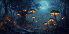 Enchanted Forest Night Scene Glowing Mushrooms Moonlight Fantasy