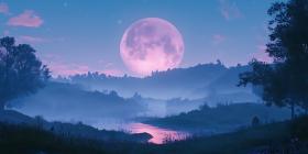 Pink Moon Landscape Night Scene with Misty Forest and River