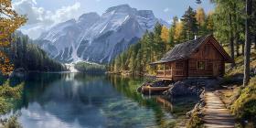 Serene Mountain Cabin Landscape Picturesque View of Alpine Lake
