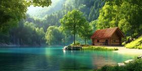 Secluded Lakeside Cabin Lush Greenery Tranquil Water Perfect E