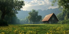 cabin meadow field grass trees forest woods nature landscape scenery countryside rural peaceful tranquil serene calm quiet cottage house home building sunlight sky clouds green yellow flowers flora plants environment outdoor scenic view vista background desktop wallpaper digital art illustration artwork artSimilar Photos