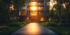 apartment building sunset sun golden hour architecture modern architecture luxury apartment residential building greenery lush greenery trees pathway paved path entrance building exterior evening twilight peaceful tranquil calm serene vibrant colors warm light natural light landscaping garden urban landscape cityscape residential area real estate property home house building design exterior contemporary elegance sophisticated scenic view beautiful sunset view evening viewSimilar Photos