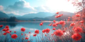 lake mountains poppies red flowers nature landscape scenic beautiful calm serene peaceful tranquil mist fog sky blue water reflection vibrant color sunlight dreamlike ethereal background wallpaper desktop scene view panorama artistic visual art photography image pretty floral botanical summer spring outdoors natural environmentSimilar Photos
