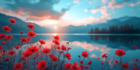lake sunrise sunset mountains poppies red flowers nature landscape scenic beautiful peaceful serene vibrant colors reflection water sky clouds calm tranquil majestic panorama view scene pretty amazing gorgeous breathtaking artistic artwork digital art illustration fantasy dreamlike idyllic romantic inspiring motivational hopeful optimistic peaceful landscape nature photography travel destinationSimilar Photos