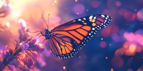 Monarch Butterfly in Flight Vibrant Wings Against a Dreamlike Pu