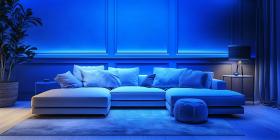 Serene Blue Living Room Ambient Lighting and Modern Sectional