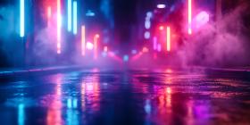 Neon Cityscape Vibrant Pink and Blue Lights Reflecting on Wet St