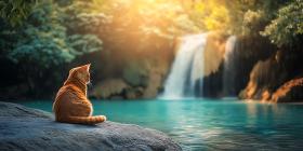 cat waterfall nature ginger cat serene peaceful tranquil water rocks sunlight forest jungle tropical animal wildlife landscape scenic photography travel adventure meditation calm relaxation beauty harmony peace quiet stillness contemplation reflection sun rays green lush vibrant colors cat sitting waterfall scene natural beauty outdoor wild faunaSimilar Photos