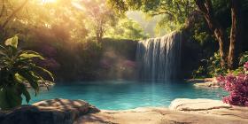 waterfall tropical paradise nature landscape pool water sunlight lush foliage green leaves plants rocks stones scenic view beautiful serene peaceful tranquil relaxation wellness escape getaway travel vacation holiday tourism destination summer tropical paradise waterfall pool jungle forest oasis hidden gem natural beauty vibrant calm peaceful scene photography backgroundSimilar Photos
