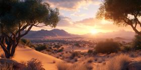 sunset desert landscape golden hour sun nature photography panorama vista scenic arid mountains hills trees vegetation sand dunes path trail horizon sky clouds warm glow light rays beautiful scenic view natural outdoor travel adventure exploration serene peaceful tranquil environment ecosystem wildlife habitat habitat background texture scenic landscape nature sceneSimilar Photos