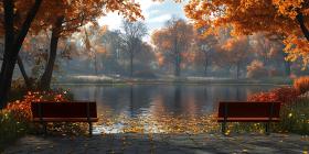 Autumnal Park Scene Serene Lake Colorful Trees and Park Benches
