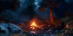 Night Forest Campfire Epic Wilderness Scene Realistic Bonfire in