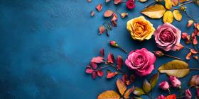 roses flowers petals autumn leaves fall floral arrangement blue background texture colorful vibrant closeup macro nature botanical beauty elegant design artistic photography still life composition color contrast seasonal rose petals autumn leaves floral design water drops texture background vivid colors bright fall colors rose blossoms delicate velvety dark blue scattered full bloom intense colorSimilar Photos