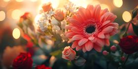 gerbera daisy rose bouquet flowers blossom pink red white floral bloom botanical nature plant petals closeup macro photography image background texture light warm golden bokeh romantic celebration beauty artistic vibrant delicate dew drops garden sunlit floral arrangement wedding event festive elegant pretty charmingSimilar Photos