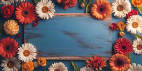 Vibrant Floral Frame Blue Wooden Background for Design Projects