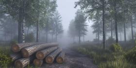 Misty Forest Path Lumber Pile Scene Nature Photography